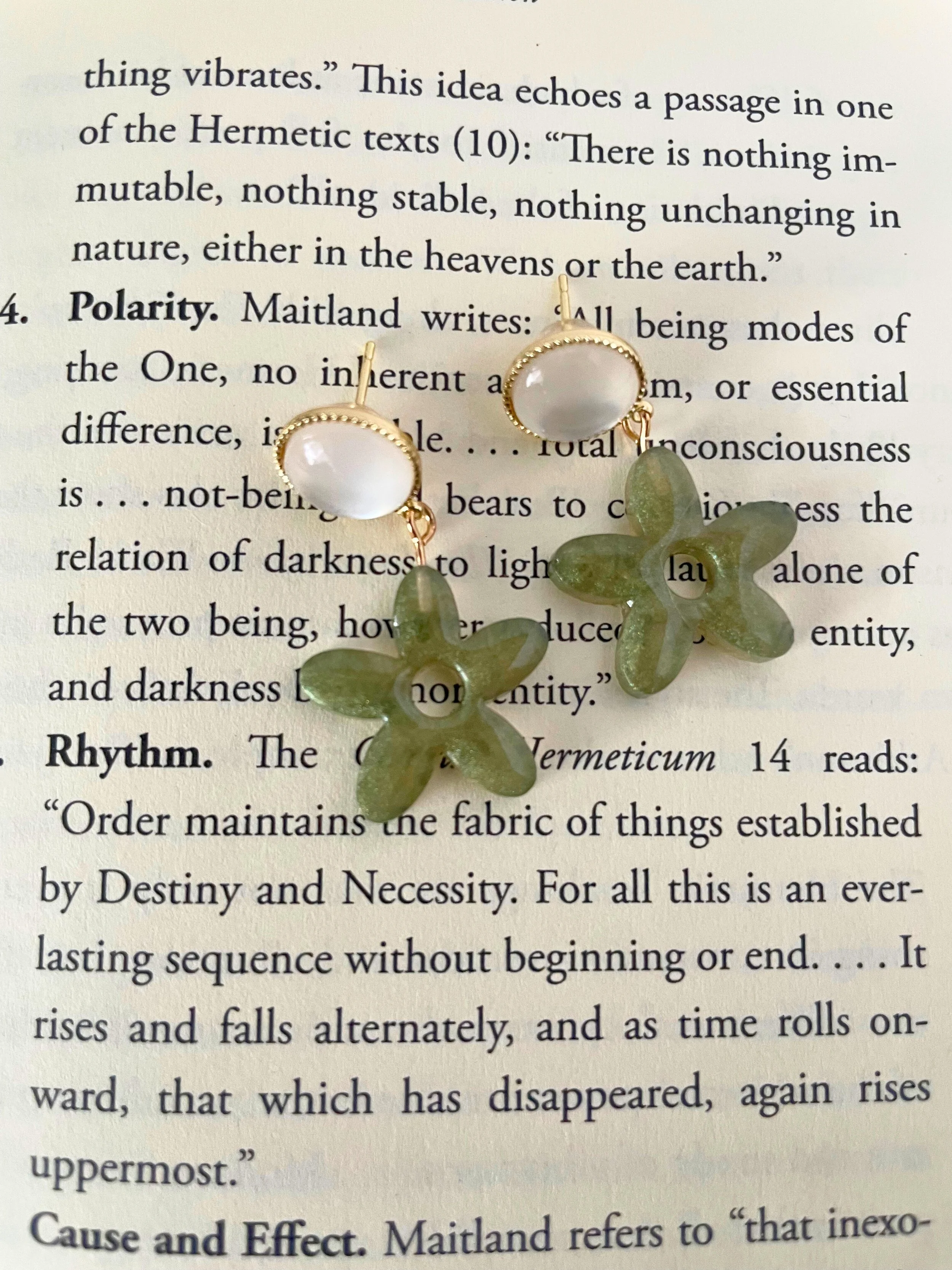 Hice estos aretes inspirados por el hermoso tono verde de la resina. Donde yo vivo prácticamente no hay flores verdes (aunque claro que existen), entonces dudé en hacer estas flores pero al final no me resistí. El color me pareció perfecto para combinar con los montantes de ópalo sobre latón laminado en oro de 14k, con una aplicación de resina que simula un ópalo. Me gusta el contraste que hace con la figura de la flor de resina, divertida y desenfadada, pero de un color lo suficientemente sobrio para conservar la elegancia.